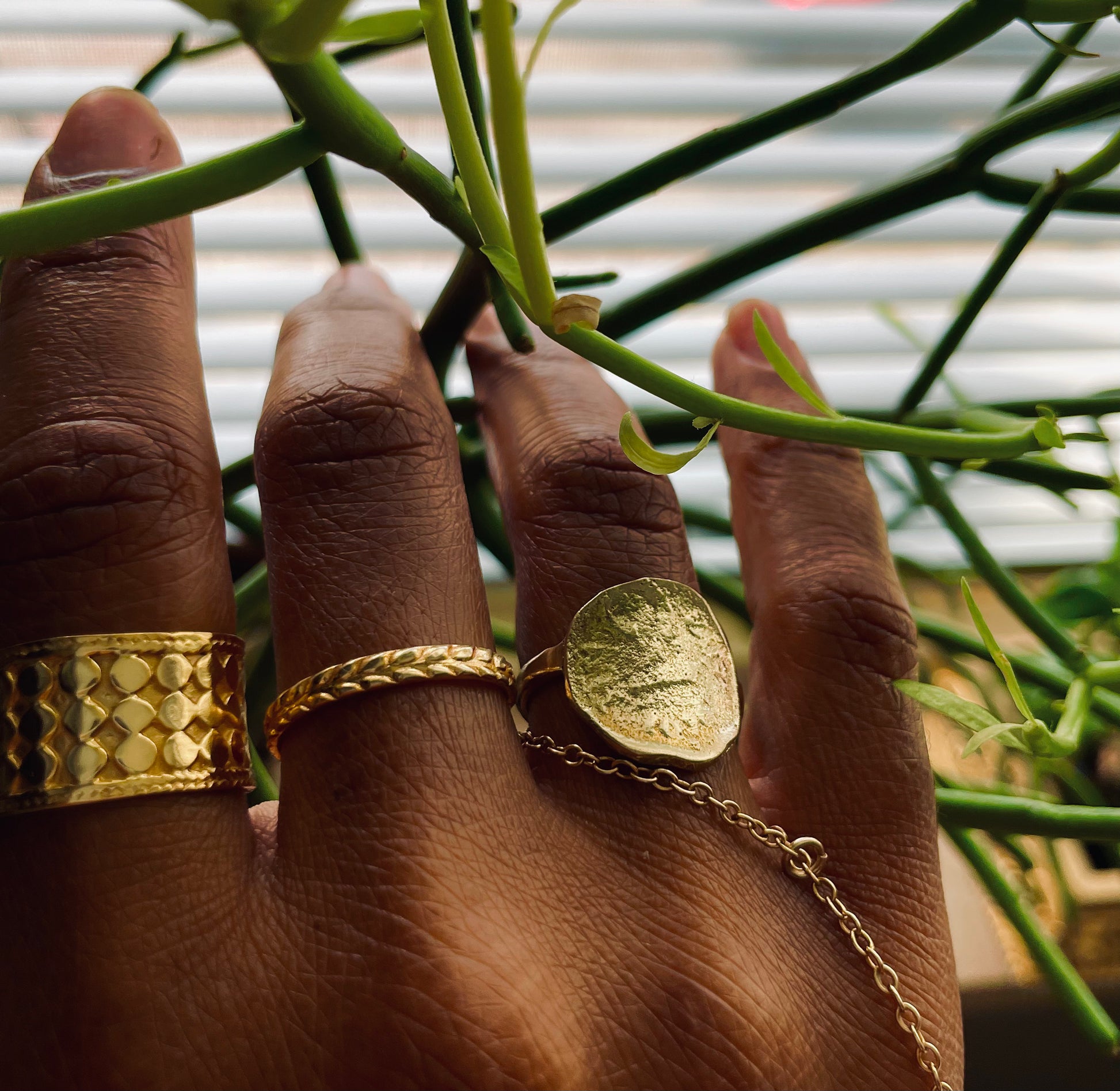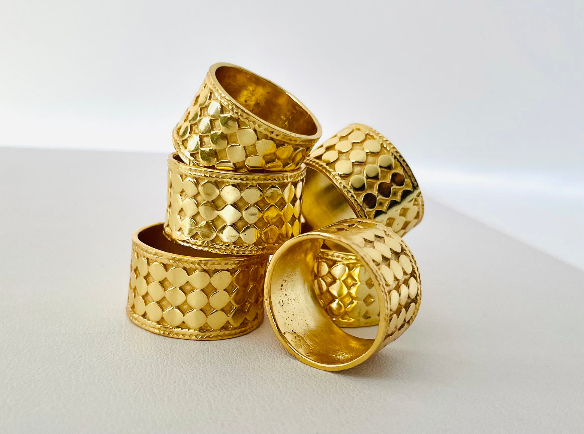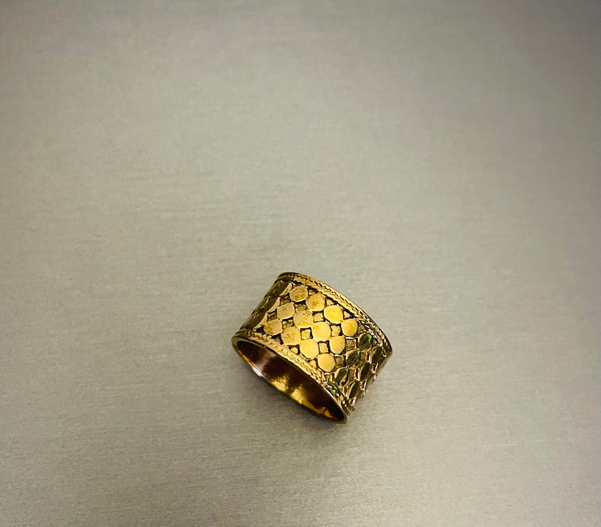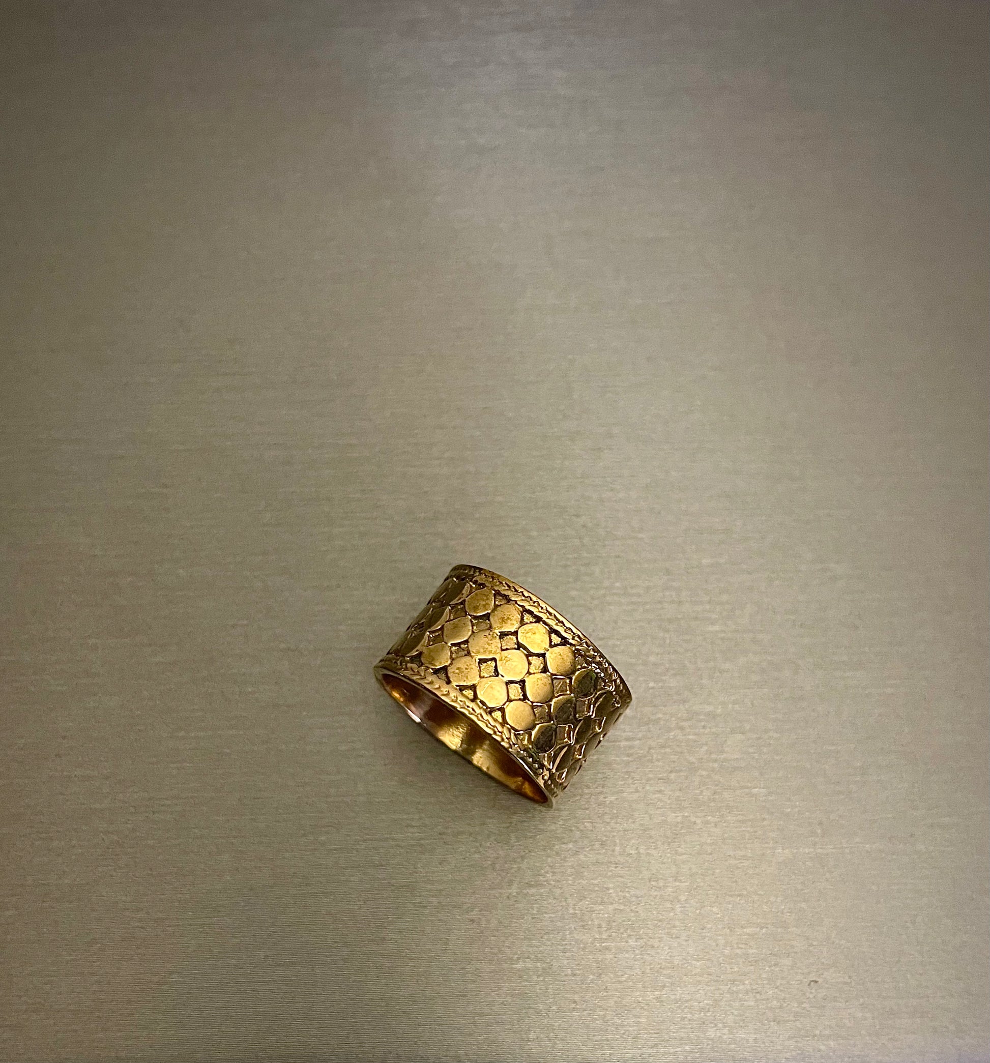 A solid brass band cloaked in circles with a subtle, imperfect braided border.