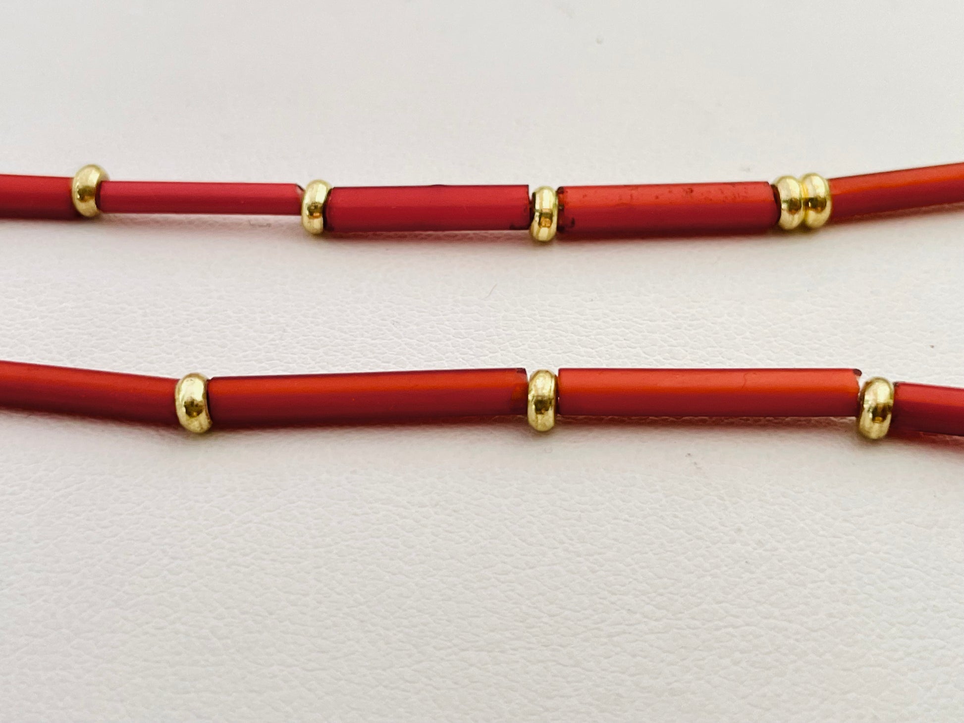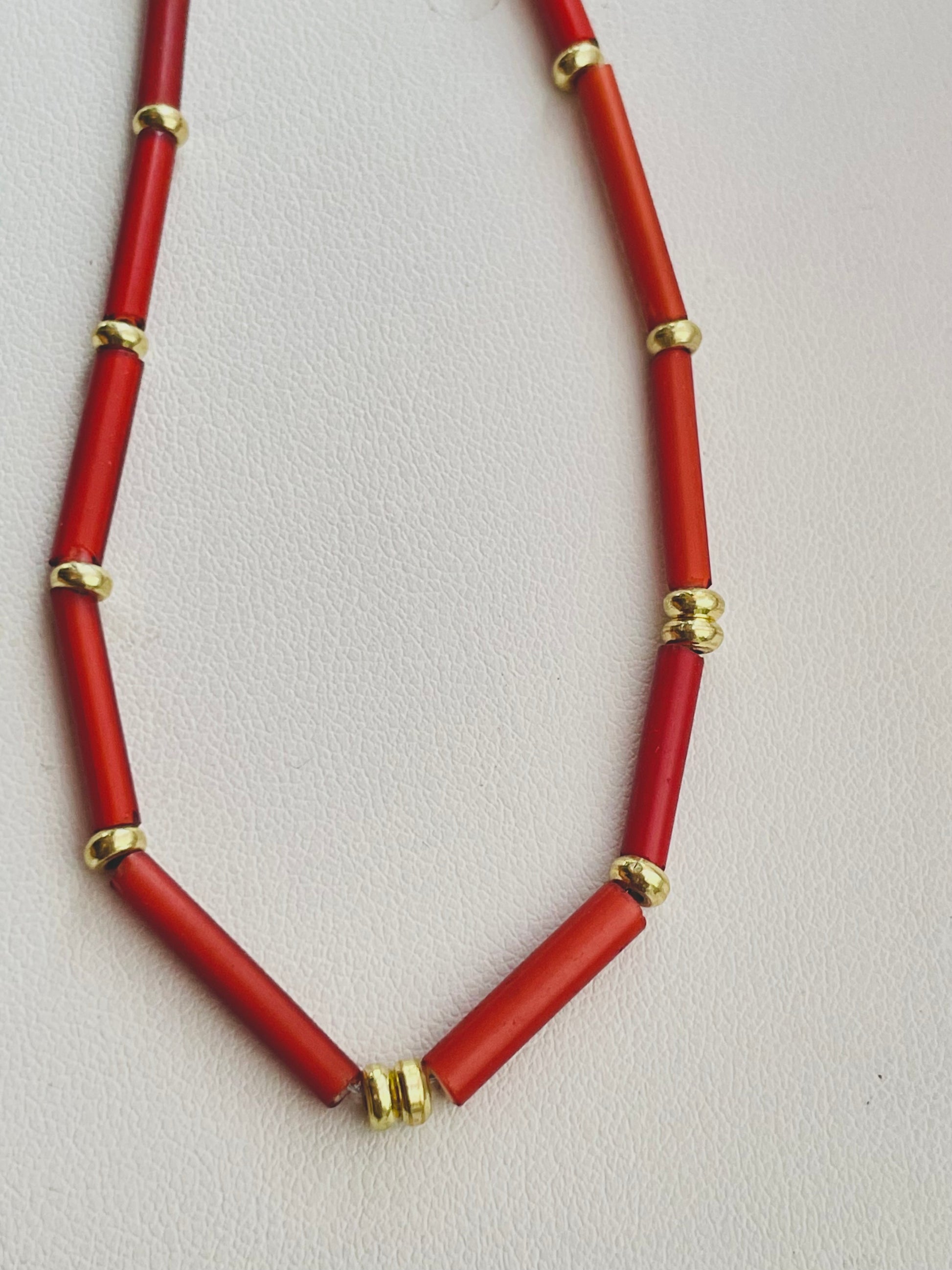 Alternating Venetian brick red tube beads + brass heishis.
